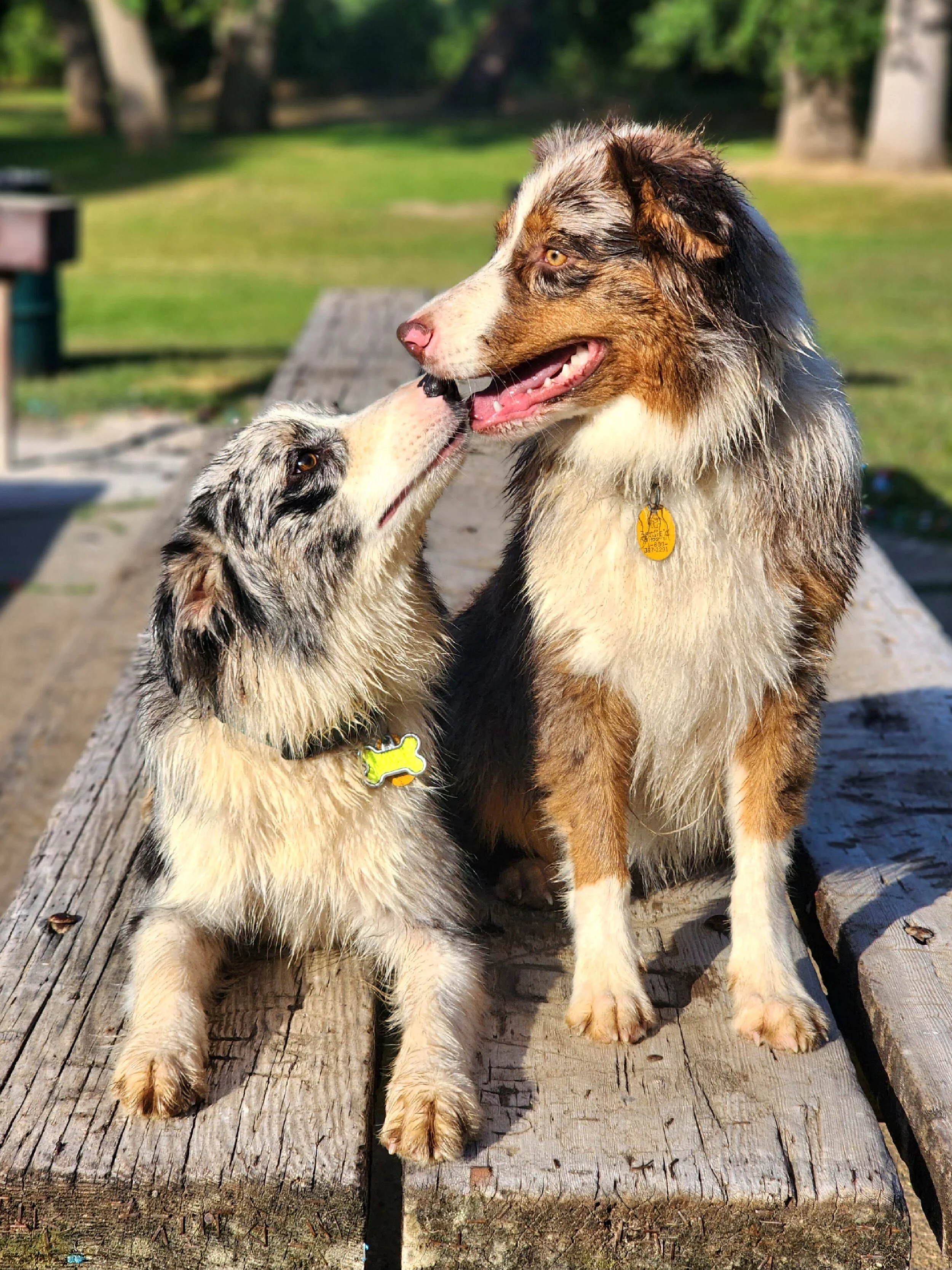 Skye and Koda, two of our foundation females, sharing a kiss (or at least Skye was) after romping around in the Sacramento River
